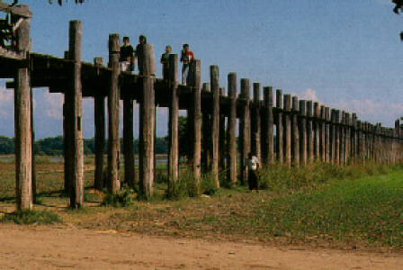 South of the Patodawgyi Pagoda the shallow Taungthaman Lake is crossed by a huge teak bridge. During the dry season the bridge crosses dry land. U Bein was the “mayor” at the time of the shift from Inwa and he wisely salvaged material from the deserted Inwa Palace to build this km long footbridge. It has stood the test of time for two centuries.